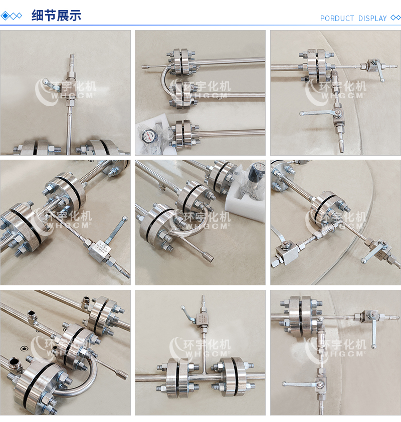 常規(guī)釜蓋開口 氣相口配針形閥,液相口配針形閥及釜內(nèi)插底管,固體加料口配絲堵,測控溫口配鉑電阻,壓力表安全爆破口配壓力表及安全防爆裝置,釜內(nèi)冷卻盤管進(jìn)、出口配水咀